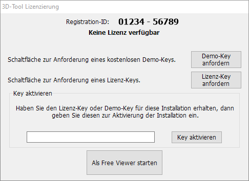 Ohne gültigen Lizenz-Key oder Demo-Key können Sie 3D-Tool nur als Free Viewer mit eingeschränktem Funktionsumfang starten.