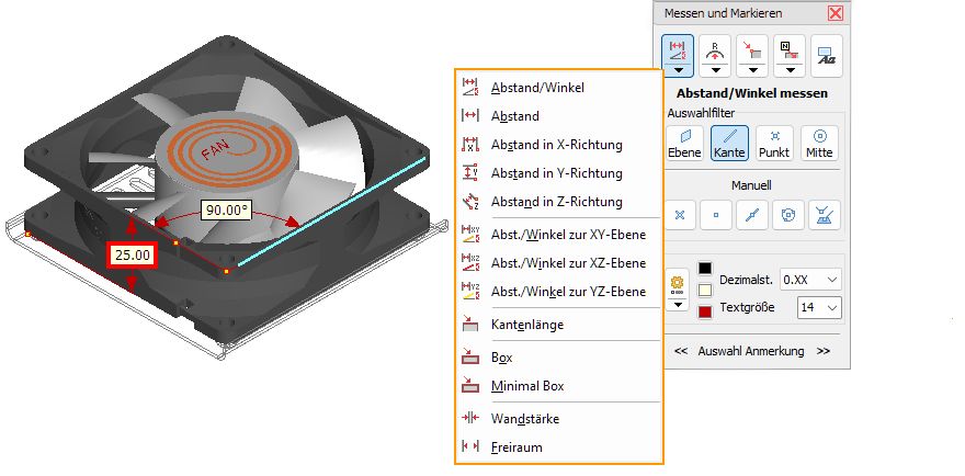 Messen Sie Abstände, Winkel, Kantenlängen, Begrenzungsboxen, Wandstärken und Freiräume.