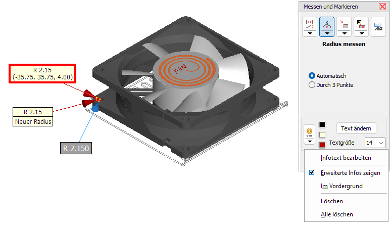Ermöglicht bei Abstandsbemaßungen zwischen zwei Flächen das Verschieben der Textbox und der Ansatzpunkte an beliebige Positionen im 3D-Raum. - Erweiterte Infos (Bei Abstandsbemaßungen, Radius und Durchmesser)