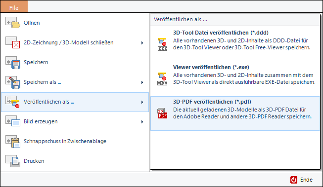 Zum Veröffentlichen als 3D-PDF klicken Sie in der Registerkarte File auf