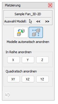 Klicken Sie auf die Schaltfläche X, Y oder Z, um alle Modelle in einer Reihe entlang der entsprechenden Achse anzuordnen.