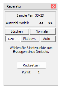 Mit dem Werkzeug Reparatur löschen Sie Flächen, reparieren gedrehte Flächen und offene Kanten, erzeugen Dreiecke und bewegen Netzpunkte.