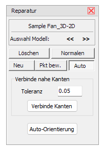 Geben in das Eingabefeld Toleranz einen Abstandswert für das automatische Verbinden von offenen Kanten ein. Die automatische Reparatur versucht, offene Kanten unter diesem Abstandswert zu schließen. Eine Erhöhung des Toleranzwertes schließt eventuell mehr Kanten.