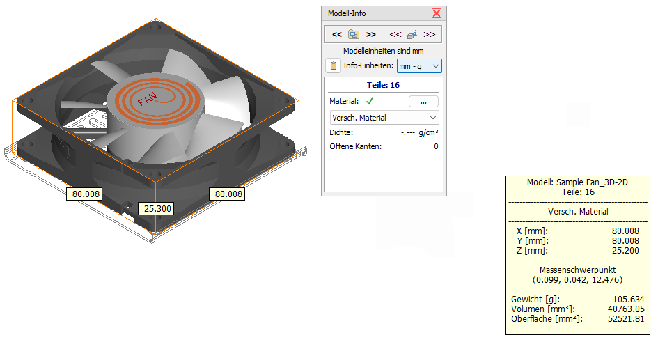 Verwenden Sie das Werkzeug Modell-Info zur Anzeige des Volumens, der Oberfläche und der Abmaße von Modellen und Teilen. Nutzen Sie die Materialdatenbank zur Gewichtsermittlung. Kopieren Sie alle Informationen in andere Anwendungen.
