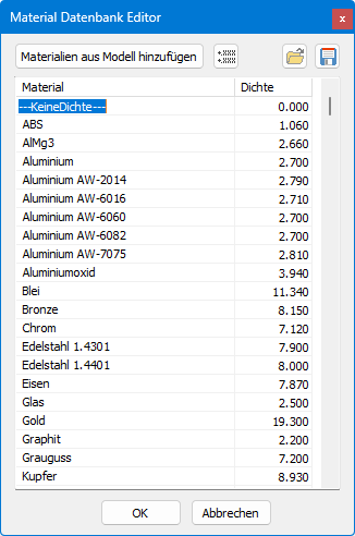 - Zum Ändern eines Eintrags in der Liste klicken Sie auf den Namen oder die Dichte eines Materials und geben den neuen Namen bzw. die neue Dichte ein. Verwenden Sie bei der Angabe der Dichte einen Dezimalpunkt und kein Komma.