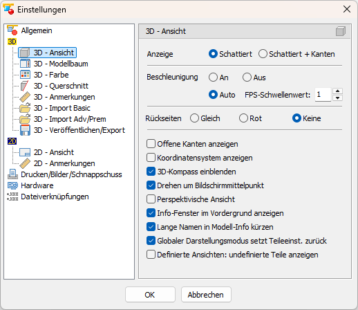 Standardeinstellungen für die 3D-Ansicht, wie z.B. die Anzeige von Flächenrückseiten und offenen Kanten.