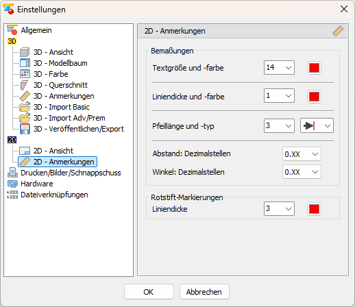 Standardeinstellungen für neue 2D-Bemaßungen und Rotstift-Markierungen.