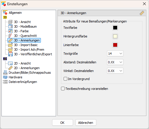 Standardeinstellungen für 3D - Bemaßungen/Markierungen.