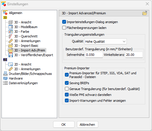- Premium-Importer für STEP, IGS, VDA, SAT und Parasolid-Dateien (Standard: Aktiv)