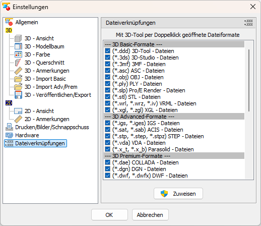 Markieren Sie alle Dateiformate, die mit 3D-Tool verknüpft werden sollen und klicken Sie auf die Schaltfläche Zuweisen.
