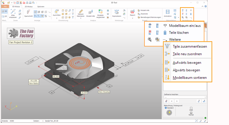 Die Funktionen zum Löschen und Organisieren von Teilen finden Sie in der Registerkarte 3D-Modus in der Gruppe Modellbaum.