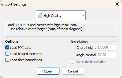 The High Quality setting uses the relative chord height based on the model's bounding box diagonal to control the accuracy when importing 3D modes. The chord height is set to 1/5000 of the diagonal, and the angle control is 20 degrees.