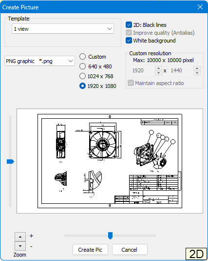 Create a BMP or JPG image of the current view or any available Custom View. To do so, a number of options, including a preview, are available.