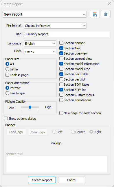 Use Report to generate details reports with details such as model information, Bill of Materials, and an overview of Custom Views as PDF, RTF, HTML and JPG/BMP.