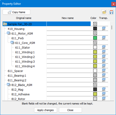 Load a property file (*.pf). Choose the properties (New name, Color, Transparency) to be transferred. Every element of the table whose original name matches a name in the property file will receive the properties stored in the file. You can continue to work on the table. Click on Apply changes to apply the changes you have made.