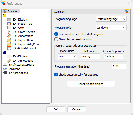 Select one of the available languages for program start-up. Choosing System language will start 3D-Tool in the system language of Windows, if available, otherwise in English.