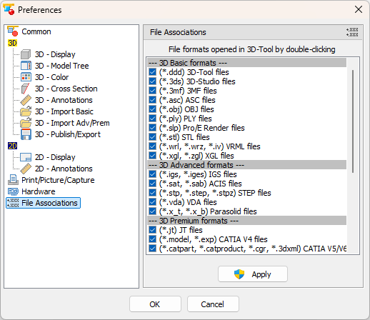 Check all file formats you want to associate with 3D-Tool, and click Apply.