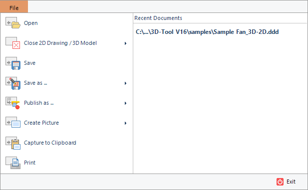 Use the File tab to load, save, publish files, and create print-outs or picture files. Additionally, a list of recently used files is shown.