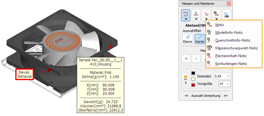 Bringen Sie Notizen, Modellinformationen, Querschnittinformationen, Massenschwerpunktinformationen, Flächeninhaltinformationen oder Konturlängeninformationen an 3D-Modellen an.