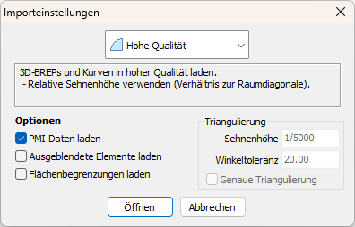 Die Einstellung "Hohe Qualität" verwendet die relative Sehnenhöhe bezogen auf die Raumdiagonale zur Steuerung der Genauigkeit beim Import von 3D-Modellen. Die Sehnenhöhe ist auf 1/5000 eingestellt, und die Winkeltoleranz beträgt 20 Grad.