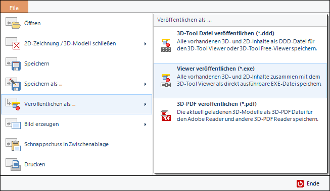 Veröffentlichen Sie alle geladenen 3D-Modelle und 2D-Zeichungen zusammen mit dem 3D-Tool Free Viewer als direkt ausführbare EXE-Datei. 3D-Tool EXE-Dateien lassen sich auf jedem Windows-Rechner ohne Installation direkt starten.