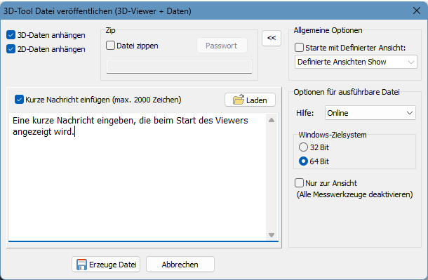 Eine bis zu 2000 Zeichen lange Nachricht eingeben. Die Nachricht erscheint beim Start der EXE-Datei im Startfenster.