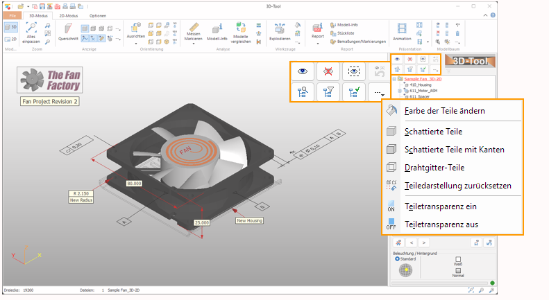 Die Funktionen zum Ein- und Ausblenden und zum Ändern der Darstellung von Teilen finden Sie in der rechten Seitenleiste über dem Modellbaum.