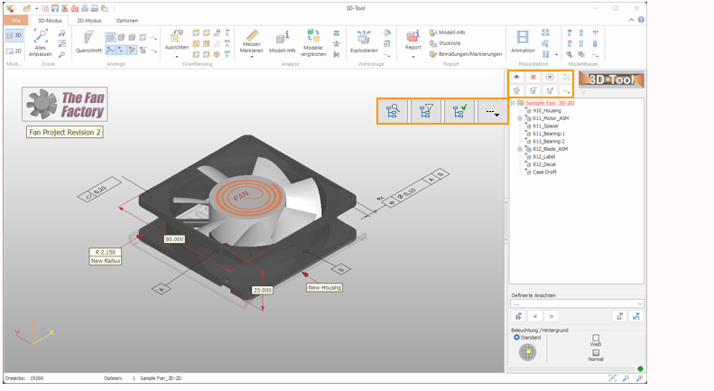 Für Modelle mit sehr vielen Teilen und Baugruppen bietet 3D-Tool hilfreiche Funktionen zum Durchsuchen des Modellbaums, zum Filtern der Teile im Modellbaum und zur Auswahl von Teilen anhand eines Suchbegriffs.