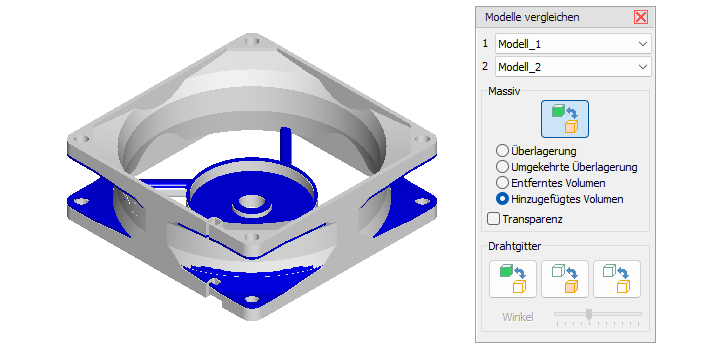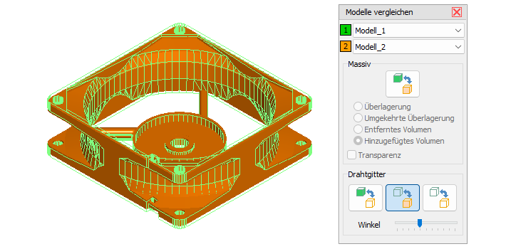 Modell 1 massiv anzeigen und Modell 2 als Drahtgitter über Modell 1 legen. An Stellen, an denen Sie nur Drahtgitterlinien des Modells 2 oder nur massive Flächen des Modells 1 sehen, unterscheiden sich die Modelle.