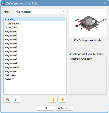 Wird die ausgewählte Ansicht in einer Animation verwendet, erscheint hier der Name der entsprechenden Animation. Beim Löschen der Ansicht wird auch die Animation gelöscht. Das Ändern der Namen und Reihenfolge von Definierten Ansichten hat keinen Einfluss auf die Animation.
