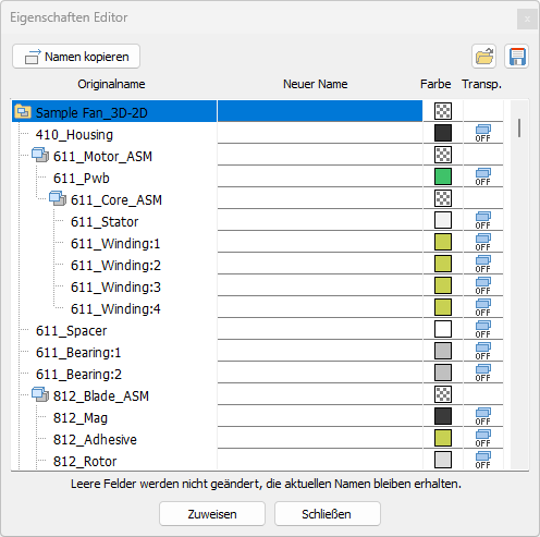 - Für Baugruppen selbst werden nur neue Namen übernommen. Für die Teile einer Baugruppe werden alle beim Laden ausgewählten Eigenschaften übernommen.