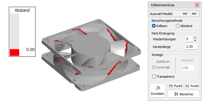 Verwenden Sie die Kollisionsanalyse, um Bauteilkollisionen zu prüfen und die Abstände zwischen Bauteilen farblich darzustellen.