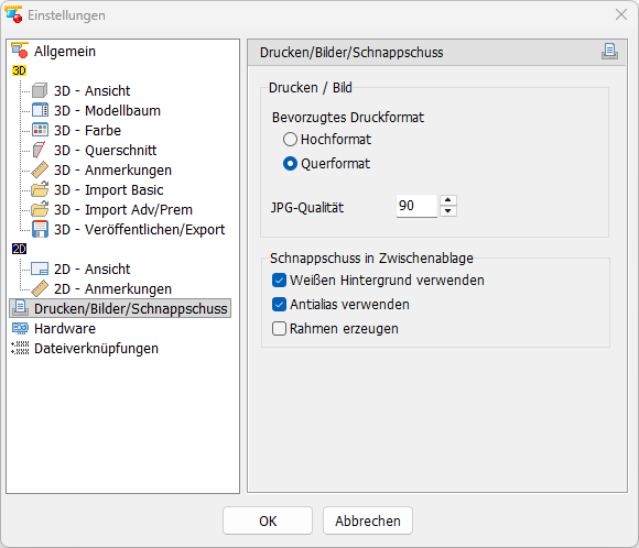 Standardeinstellungen beim Drucken, Bild erzeugen und Schnappschuss in die Zwischenablage.