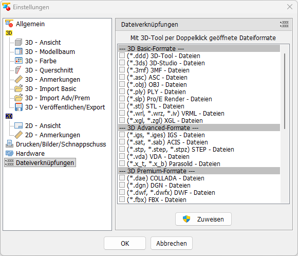 Markieren Sie alle Dateiformate, die mit 3D-Tool verknüpft werden sollen und klicken Sie auf die Schaltfläche Zuweisen.