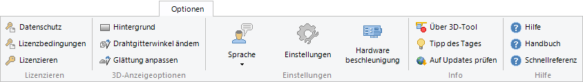 In der Registerkarte Optionen passen Sie 3D-Tool an Ihre Bedürfnisse an, lizenzieren das Programm und erhalten Informationen zur Programmversion und zu verfügbaren Updates.