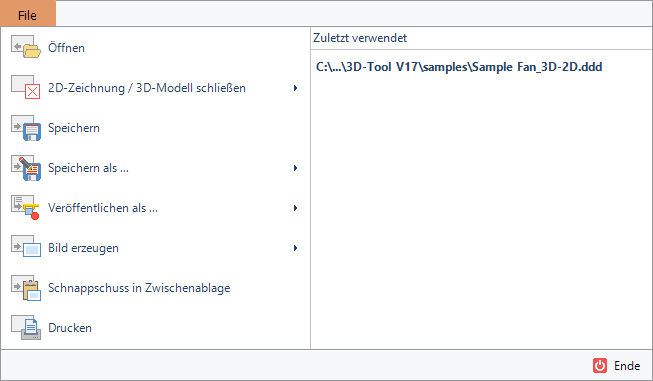 Verwenden Sie die Registerkarte File zum Laden, Speichern und Veröffentlichen von Dateien und zum Erzeugen von Ausdrucken und Bilddateien. Außerdem wird eine Liste zuletzt verwendeter Dateien angezeigt.