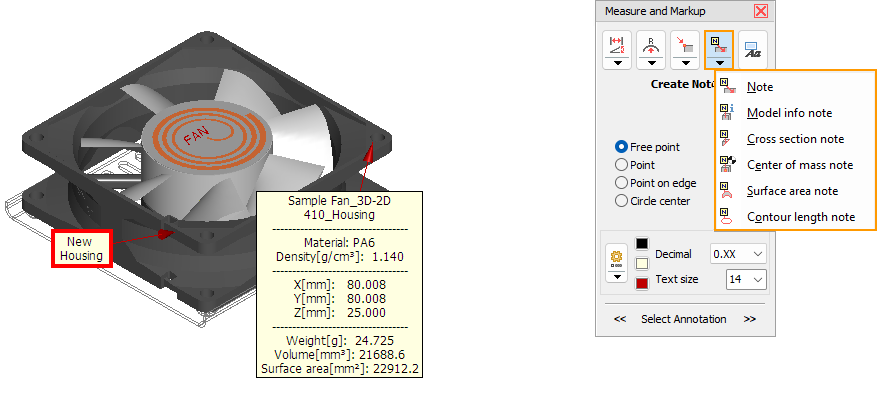 Attach notes, model info notes, part info notes. cross section info note, or surface info notes on the model.