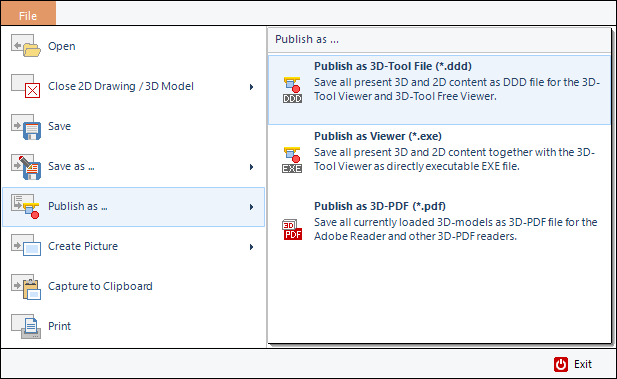 Publish all loaded 3D models and 2D drawings as a 3D-Tool DDD file. DDD files can be opened and viewed with the 3D-Tool Free Viewer on any computer with a Windows operating system.