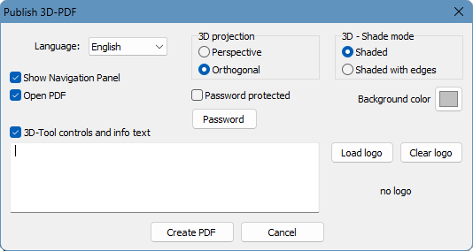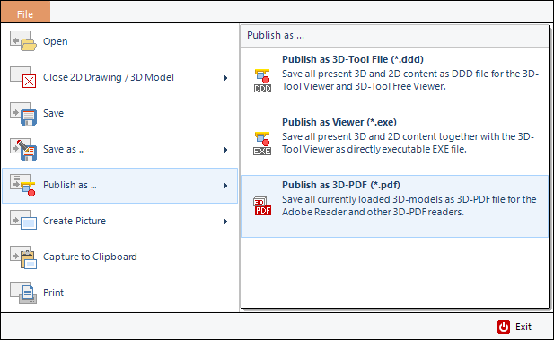 Publish 3D-PDF (not available with the Free Viewer and EXE files)