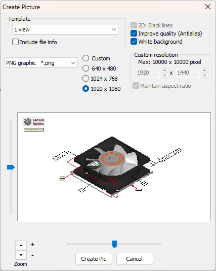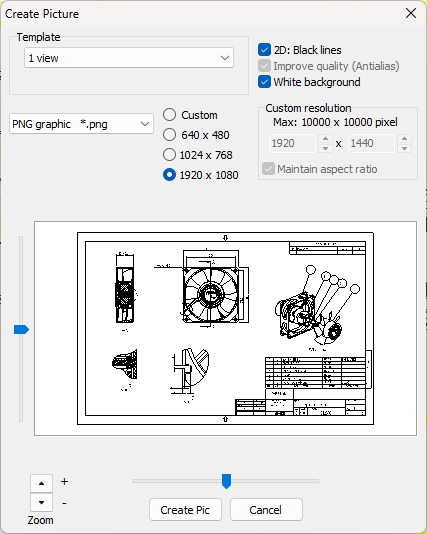 Create a BMP or JPG image of the current view or any available Custom View. To do so, a number of options, including a preview, are available.