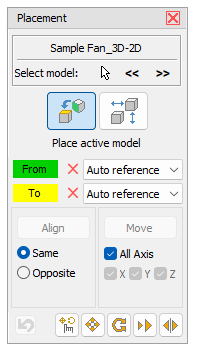 Click on Move to reposition the active model. The move button is only activated if the move is possible with the target references that are selected. Use the All Axis, x, y, z option to determine which coordinates of the active model are affected.