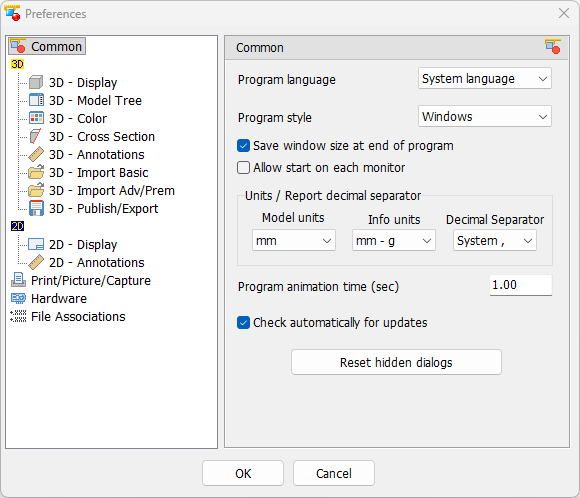 Select one of the available languages for program start-up. Choosing System language will start 3D-Tool in the system language of Windows, if available, otherwise in English.