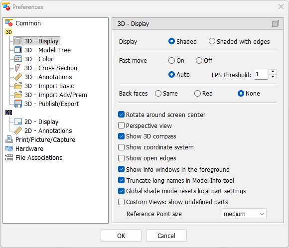 Default settings of the 3D Display such as the display of back faces and open edges.