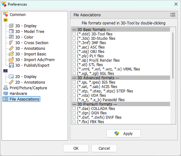 Check all file formats you want to associate with 3D-Tool, and click Apply.