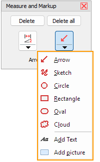 - To delete all 2D dimensions and/or all 2D markups (redline markups, texts, pictures), click the Delete All button in the right info panel.