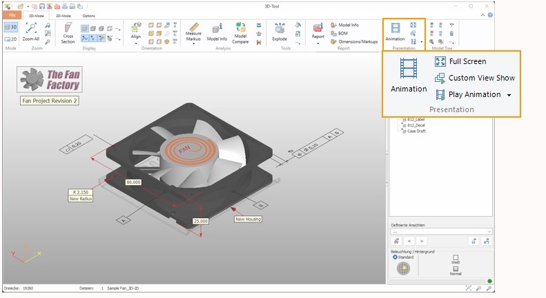 The presentation functions are located in the Presentation group of the 3D-Mode and 2D-Mode tab.