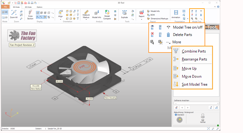 The functions to arrange and delete parts are located in the Model Tree Group of the 3D-Mode tab.